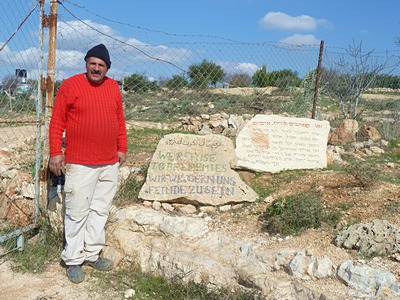 Daher Nassar voor de ingang, met op de steen de tekst: We refuse to be enemies. (foto: Frank Mulder)