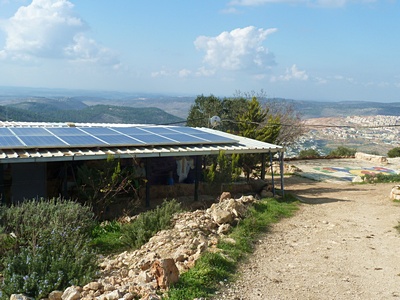 De zonnepanelen, gebouwd met hulp van internationale vrienden. Op de achtergrond joodse nederzettingen (foto: Frank Mulder)