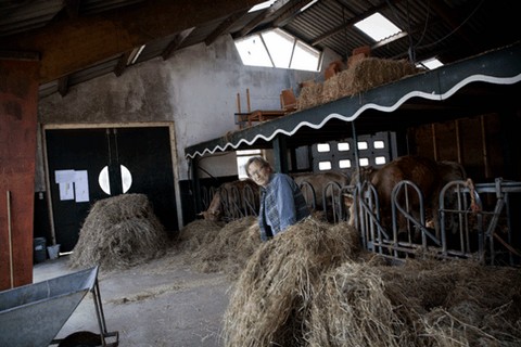 HET IS DE OCHTEND tevoren en er miezert een koude regen. Terwijl Schaap in zijn verkeerstoren de melkprogramma’s instelt, is zijn brede buurman bezig zijn Blonde Aquitaine-stieren te voeren, gewoon met de blote hand. Of beter gezegd: met een riek, maar dan nog is het een zware klus om de enorme baal voer op de juiste manier uit te rollen en over de hokken te verdelen. ‘Het oude restvoer gooi ik ertussen, dat levert goede humus op in het voorjaar, als de dieren naar buiten gaan.’