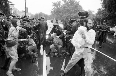 Protest tegen de Vietnamoorlog; in Washington verbranden demonstranten oproepkaarten, 17 juni 1968 (AP).