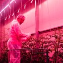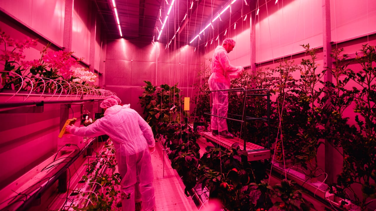 Deze indoor-farmingcontainer gaat veel verder dan de klassieke glastuinbouw. Niet alleen staan de planten niet meer in de grond (dat is intussen bijna normaal) maar ook staan ze niet meer in het daglicht. Er komt geen streepje licht naar binnen. Het sprookjesachtige licht komt uit een slim systeem van ledlampen die minder intens zijn dan de zon, en dat is handig, want dan kun je de planten veel langer verlichten zonder dat ze uitgeput raken. Ze groeien dus veel sneller, per dag. Bijkomend voordeel is dat de bladeren kleiner blijven zodat de plant veel hoger kan groeien zonder dat het de fonkelende tomaatjes onderin in de schaduw zet. Weg met de suboptimale zonsondergang!